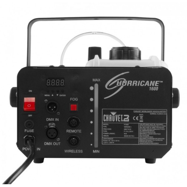 The Hurricane™ 1600 is a compact, lightweight high output fog machine that with DMX control to enhance any light show. Variable output control from DMX or the included timer remote allows for precise effect operation.The Hurricane™ 1600 features Always Ready technology providing fog on demand. A manual fog button provides easy control at your finger tips and the LED-illuminated tank enhances operation and safety. An advanced fluid sensor, with automatic shut-off protects the pump from overheating. The machine has ultra-fast heat up time for a quick setup and residue-free water based fog output.